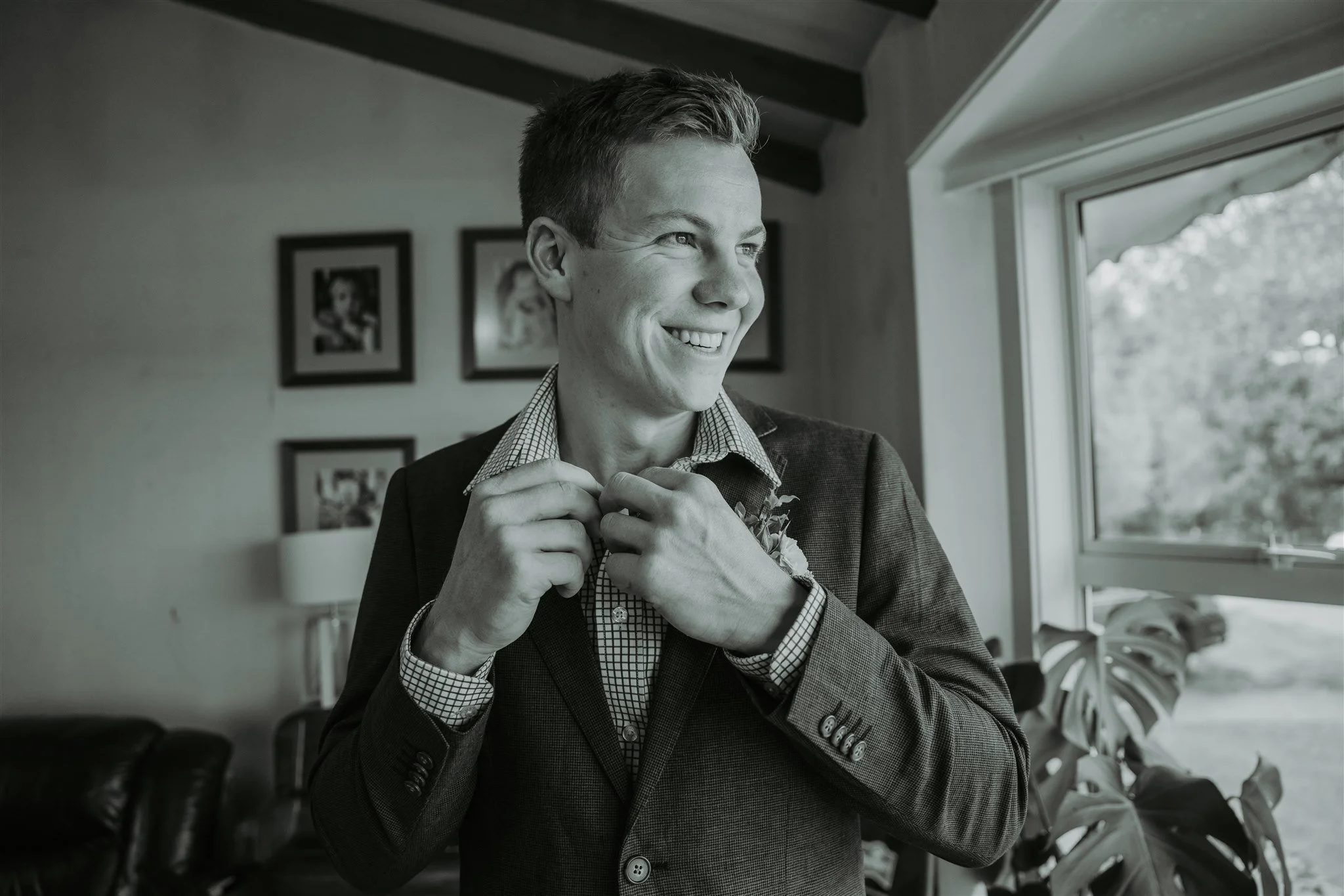 Molly got ready at a beautiful white Airbnb in Mataura, filled with soft light, large mirrors, and the quiet excitement of her bridesmaids. One of her must-have photos was her bouquet tucked inside her cowgirl boots, a perfect match for her rustic-country style. Meanwhile, James prepared at his childhood home, helping his groomsmen into their suits and boutonnieres in the cozy family lounge.